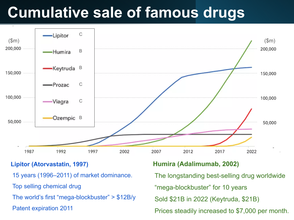 특히 키트루다나 오젬픽과 같은 바이오 신약이 과거의 화학약 챔피언인 리피토보다 훨씬 가파른 매출 성장 속도를 보이는 이유는 ‘적응증 확장성’과 ‘강력한 진입 장벽’에 있다. 단일 질환에만 쓰이다 특허 만료 후 매출이 꺾인 리피토와 달리, 키트루다는 수십 개의 암종으로 치료 범위를 계속 넓히며 마치 여러 개의 신약을 동시에 파는 효과를 내고 있고, 오젬픽은 당뇨에서 비만으로 시장을 확장하며 거대한 수요를 창출했다. 또한 바이오 의약품은 복제가 까다로운 제조 공정 덕분에 독점적 지위와 높은 가격을 장기간 유지할 수 있어, 화학약과는 차원이 다른 매출 곡선을 그리게 된다.